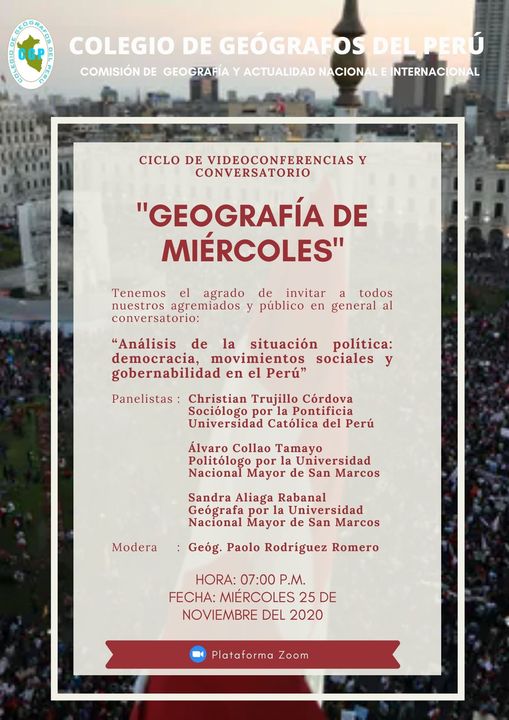 El 25 de noviembre de 2020, Geografía de miércoles tuvo un conversatorio multidisciplinario con participación de un sociólogo, un politólogo y una geógrafa, abordando el «Análisis de la situación política: democracia, movimientos sociales y gobernabilidad en el Perú».