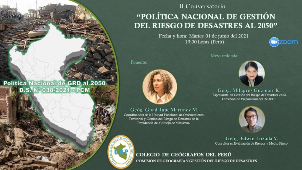 La Comisión de Geografía y Gestión del Riesgo de Desastres del Colegio de Geógrafos del Perú organizó el II Conversatorio «Política Nacional de Gestión del Riesgo de Desastres al 2050». Este evento se realizó el martes 01 de junio y contó con la participación de los siguientes profesionales: